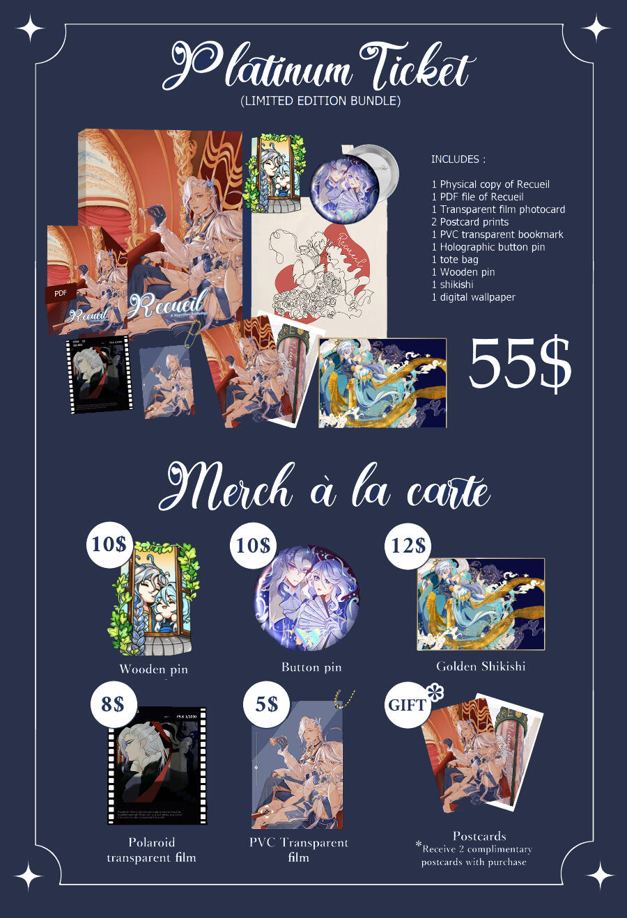 Recueil, a Neuvifuri anthology with the captivating theme of the theater arts ! This anthology will have a collection of connected stories and illustrations inspired by the grandeur, drama, and emotions of theatre. Join Furina and Neuvillette as they dive into these reimaginings.Book specification